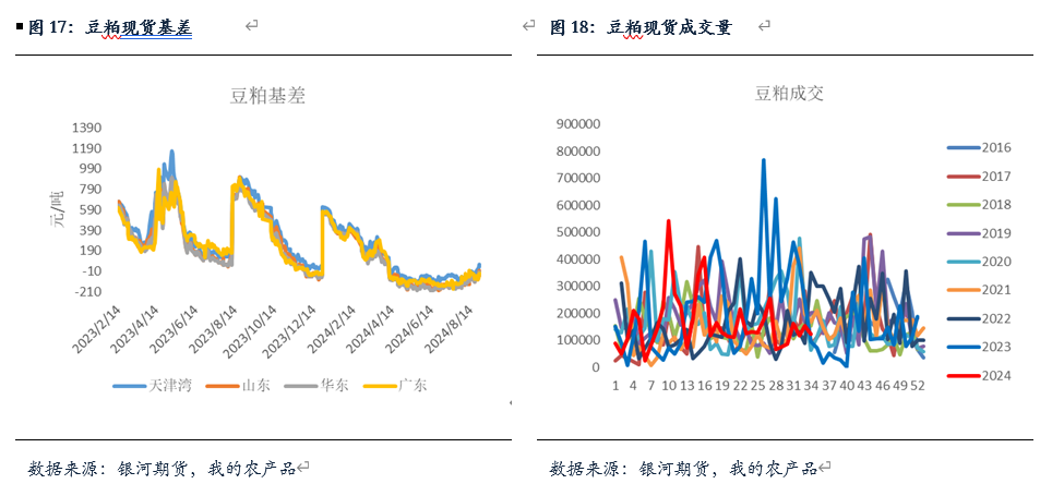近期,国内采购9-11月船期的进度整体有所加快,尤其对美豆采购速度有所加快,但是仅从当前的买船进度来看,仍然相对偏慢,因此市场还是对后续的缺口存在担忧。在此可以进行一个简单的测算,如果巴西全年出口给到9600万吨,则10-1月后续的出口量大约在1094万吨左右,按照75%的量给到中国来看,能够给到中国的量大约在820.5万吨,考虑增量溢价采购的情况,仍有望达到900万吨以上。实际上,我们对中国11-2月压榨需求给到2990万吨,意味着在此期间中国对其他来源地的进口需求仍然要维持在2000万吨左右。剔除此前中国大豆的高库存以及其他来源地的可供进口量,我们预计对于美豆的需求可能仍然要维持在1600-1700万吨左右。其实,从历史数据来看,1600-1700万吨的目标量采购难度并不大,尤其在美豆丰产的大背景下。前期采购进度偏慢一方面是对不确定性的担忧,另一方面也是因为压榨利润持续不佳。最近一段时间来,大豆压榨利润持续改善,下游采购积极性也有所提高,在此背景下,预计9月及后续豆粕现货基差好转空间有限。
