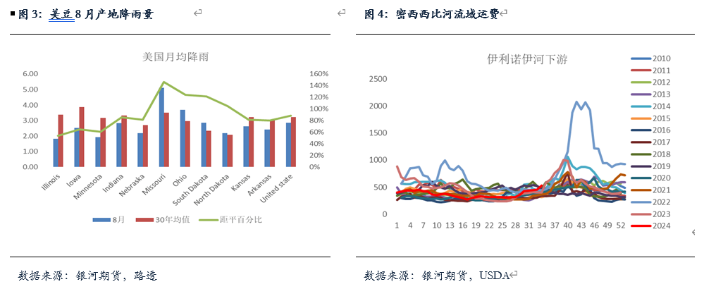 进入9月以后,我们认为美国市场关注重点仍将回归的估值的利空上来,原因在于8月后续的反弹其实是因为市场在交易驱动利空的收窄,例如,美豆产区转为干燥,美豆出口出现好转,但是本身并不带来实质性的利多。9月以后,美国将开始面临产地比较大的收割压力,当前密西西比河水位仍然偏低,运费上涨,届时可能会影响到美豆出口,成本端上或面临进一步的压力。