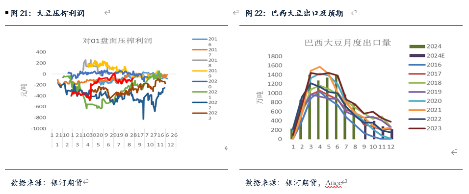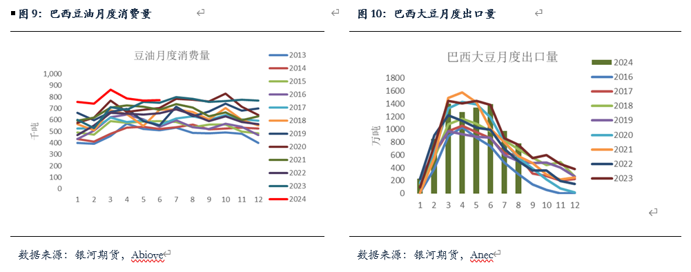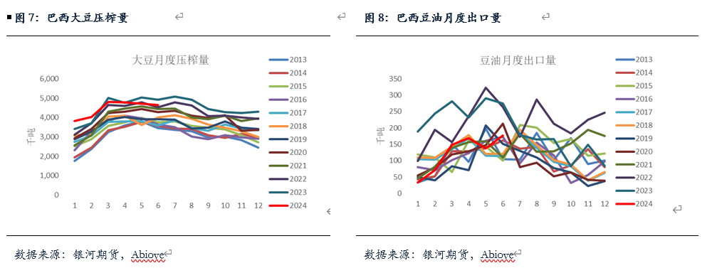 从巴西的平衡表状况来看,2024年供应大概率会较上年度有所收紧,对于巴西产量这方面,各机构评估差异太大,部分机构认为巴西大豆产量将维持在1.5-1.6亿吨区间,甚至可能更高,但conab所给到的数据明显偏低,如果按照中性的1.53亿吨来评估,那么巴西豆的出口量仍然有可能达到9600万吨以上。今年巴西出口高于预期的主要原因在于压榨表现相对偏弱,从1-6月的累积压榨数据表现来看,巴西在此期间累积压榨量不增反减,这与巴西国内大豆压榨预期增加以及豆油总消费量的增加呈现明显反向。整体来看,巴西在此期间豆油消费和生柴消费表现都比较良好,上半年以来,巴西生柴消费同比增加约28.8%,豆油消费同比增加16.16%。但是,在此期间,巴西国内豆油出口量呈现明显下降,累积同比降幅达到51.25%,受此影响,巴西国内豆油总需求同比下降约2.19%,这可能是导致巴西压榨不及预期的主要原因。