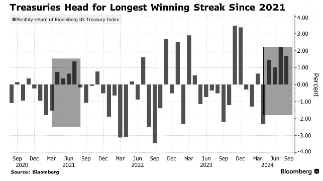 彭博美国国债总回报指数显示,截至8月28日该指数在本月的回报率已达到了1.7%,有望连续第四个月上涨。随着投资者对美国借贷成本下降的信心增强,该指数自4月底以来已持续攀升,今年以来的涨幅也随之扩大至了逾3%。