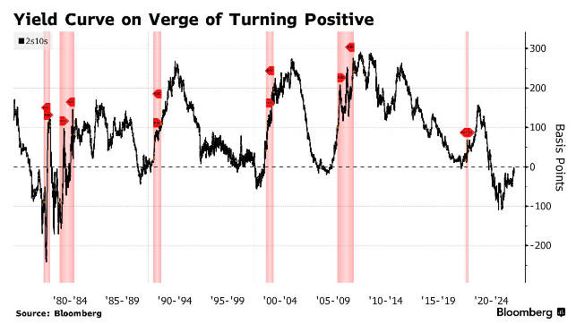 对美联储政策变化更为敏感的短期债券在本月表现尤为出色,这使得收益率曲线的一个关键部分自2022年7月以来首次濒临转正——两年期美债收益率目前只比10年期美债收益率高出不到2个基点。2023年3月,这一差距曾超过100个基点,为1981年以来最大的倒挂幅度。