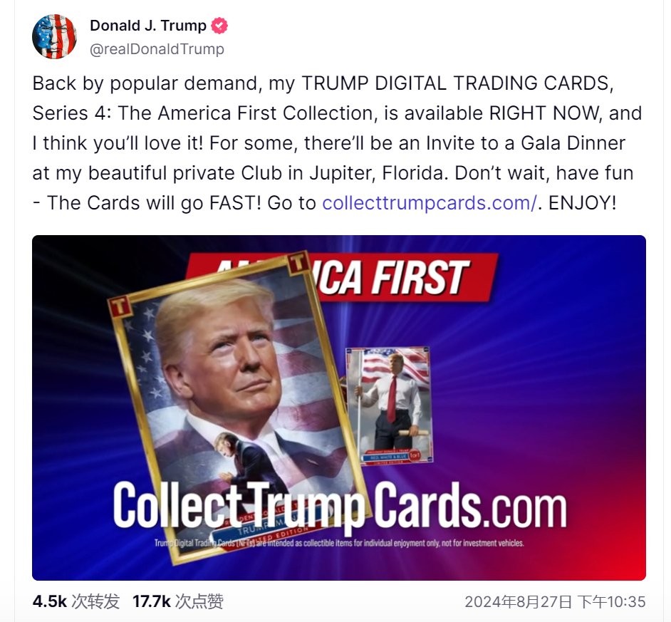 特朗普宣布这一消息的前一天,他还推出了新一批以自己形象为主题的NFT交易卡,并公开发售。